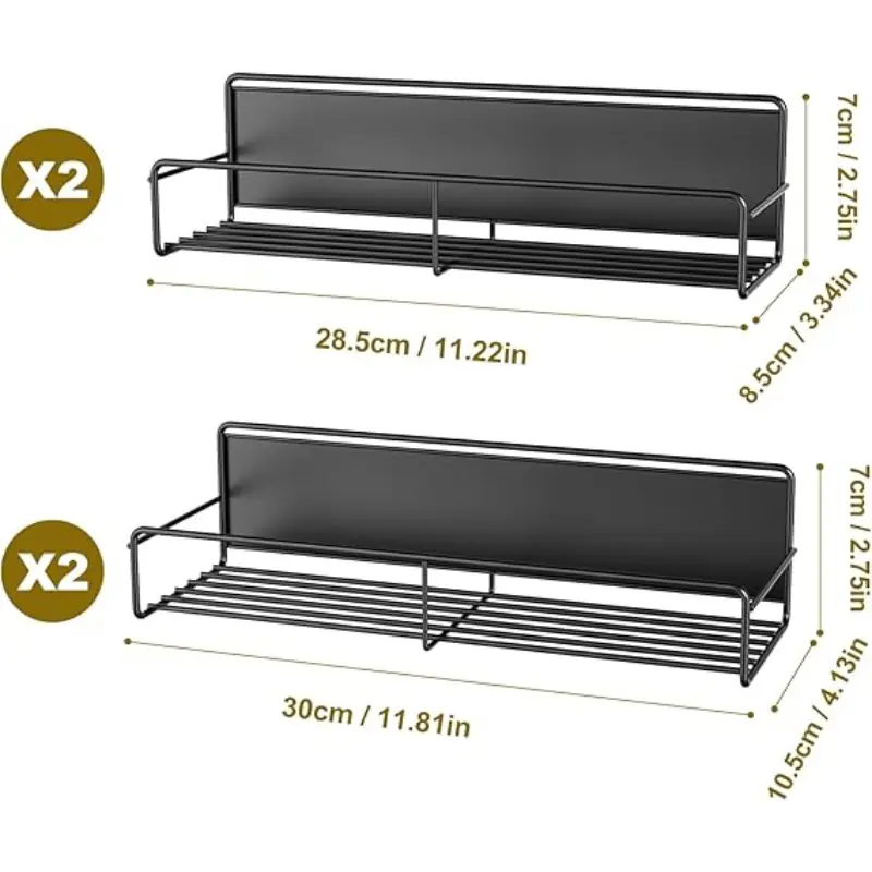 The magnetic fridge shelf made by high quality material with a black matt finish with perfect size, that can be used on various ferrous metal surface. 2 medium(11″D x 3.6″W x 2.8″H) and 2 large(11.8″D x 4.2″W x 2.8″). Suitable for all kinds of large and small spices, drinks and jars