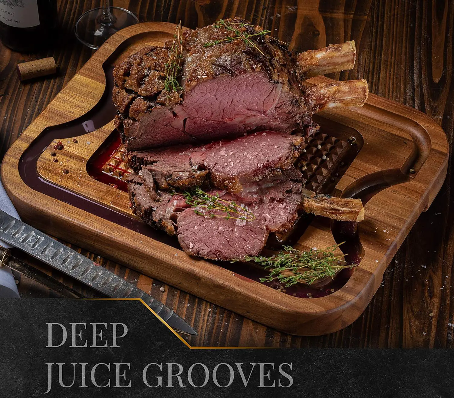Acacia Wood Cutting Board Provides a Stable, Practical Surface for Resting, Slicing & Serving Steak, Beef, Pork, Turkey, Chicken, Ham, Cheese & Other Dinner & Cocktail Fare | Unique Reversible Design Includes Grooved Side for Cutting/Chopping & Flat Side for Use as a Chic Platter