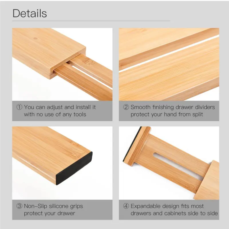 Both ends of the Bamboo Kitchen Drawer Dividers are applied with non-slip pads to protect your drawer and also the organizer itself. Drawer dividers are made of organic moso bamboo, and are durable and beautiful
