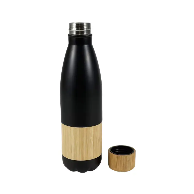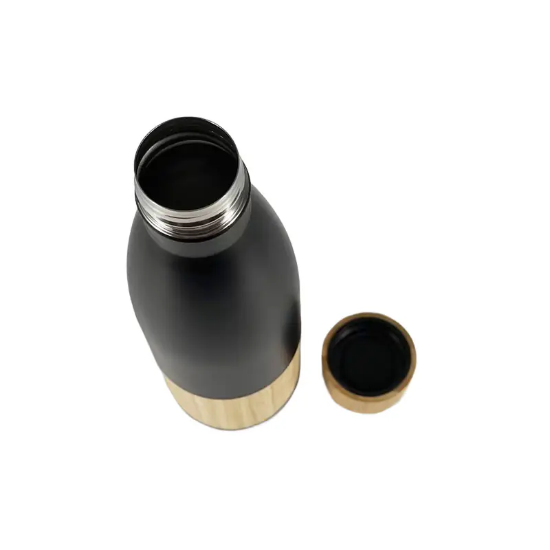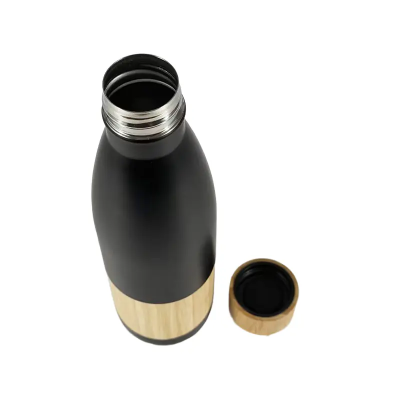 Bamboo stainless steel water bottle wholesale showcases a powerful blend of natural bamboo texture and sleek stainless steel form. The contrast between the dark matte finish and warm bamboo detail creates a sophisticated appearance that aligns with modern, eco-friendly branding. This elegant design appeals strongly to lifestyle consumers, wellness markets, and premium promotional campaigns.