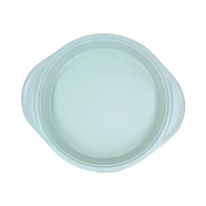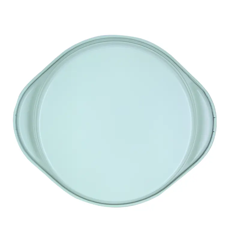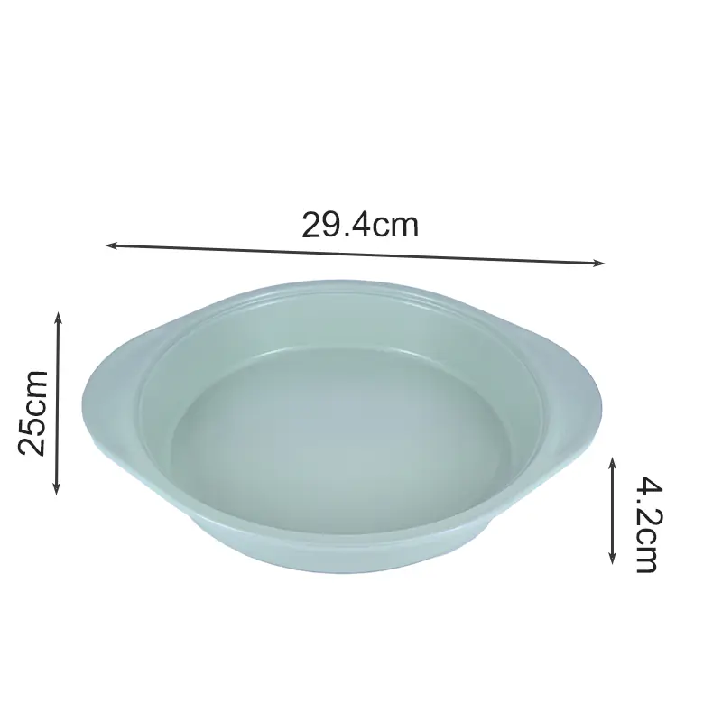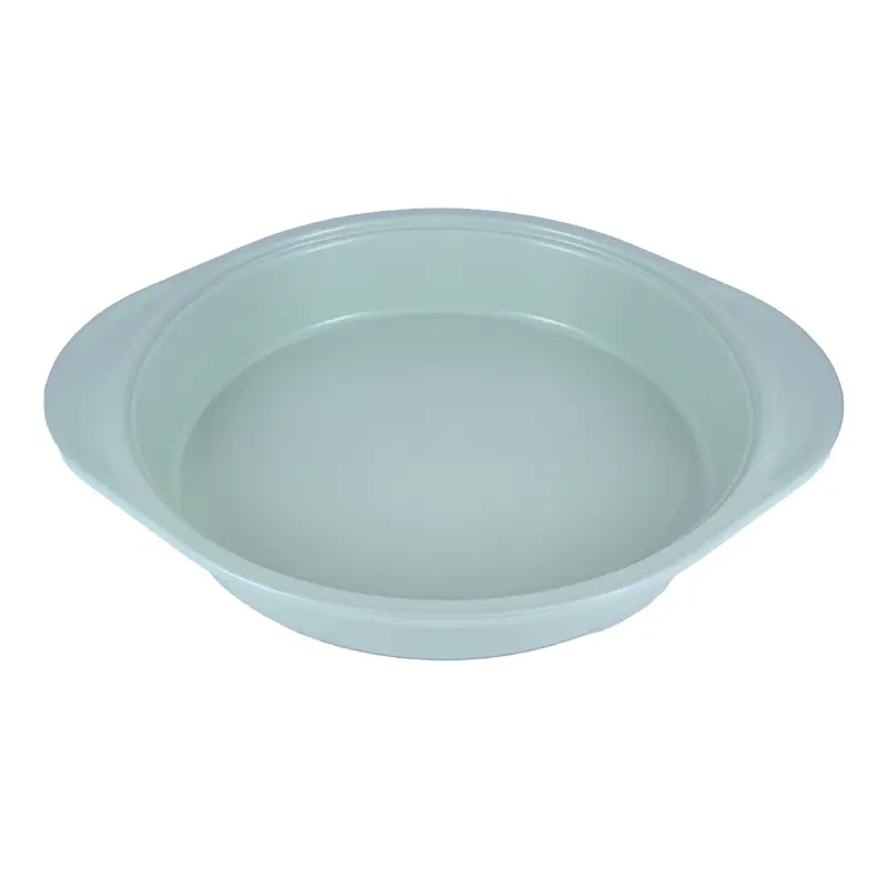 Our non stick  round cake pan is made from high-quality carbon steel with a non-stick copper silicone coating. The blue silicone handles provide a firm grip, making it a stylish and practical addition to your kitchen pans collection.