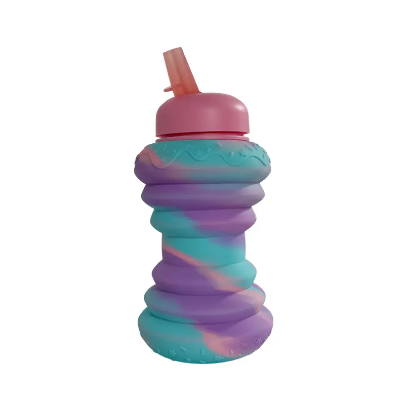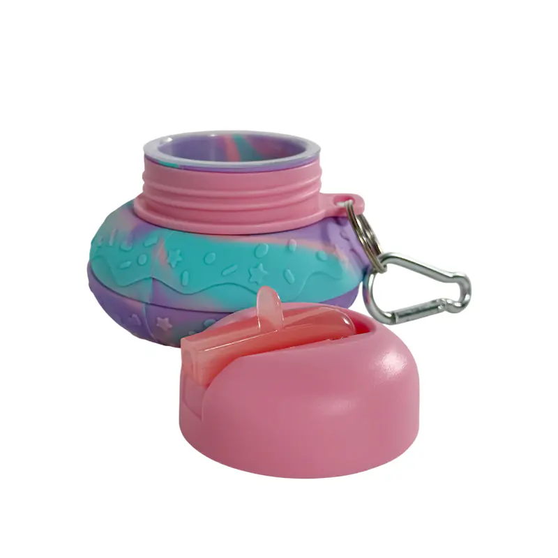 Crafted from food-grade, BPA-free silicone, it’s safe for holding drinks and flexible enough to endure repeated folding without damage. The swirled pastel colors (purple, teal, pink) with star and sprinkle textures give it a fun, eye-catching appearance.