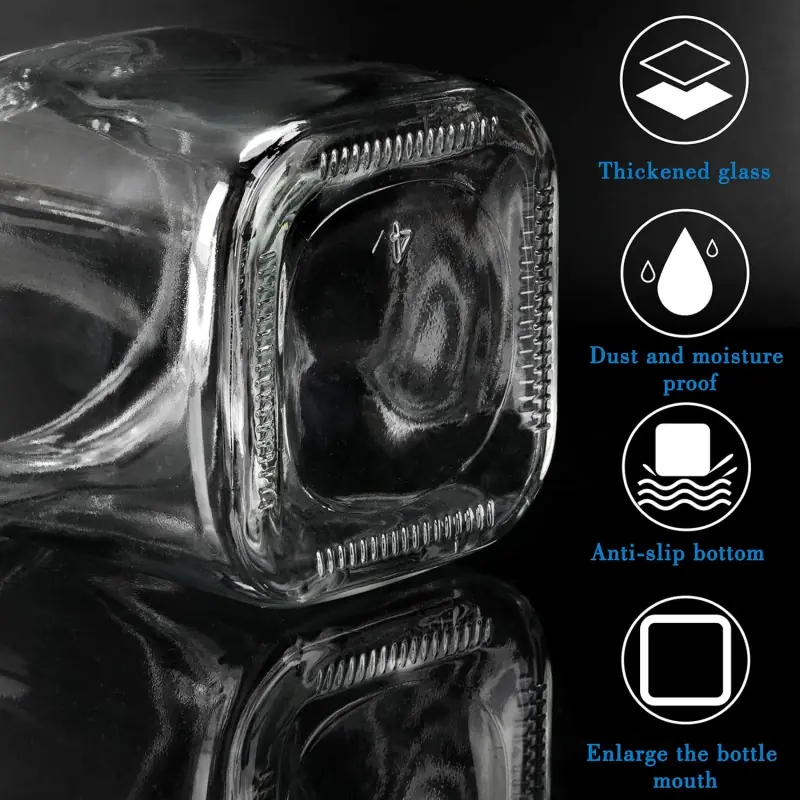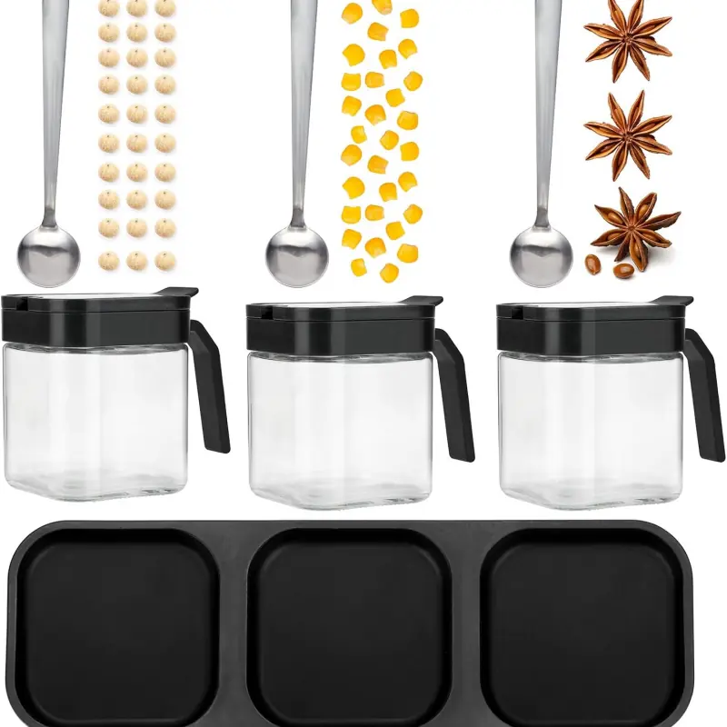 Condiment jar spice container is made of lead-free glass, Matching 304 stainless steel spoons, non-toxic harmless to humans. The base and lids adopt ABS plastic base, large diameter design of bottle mouth, easy to take and clean. A best choice to escort the health of your family