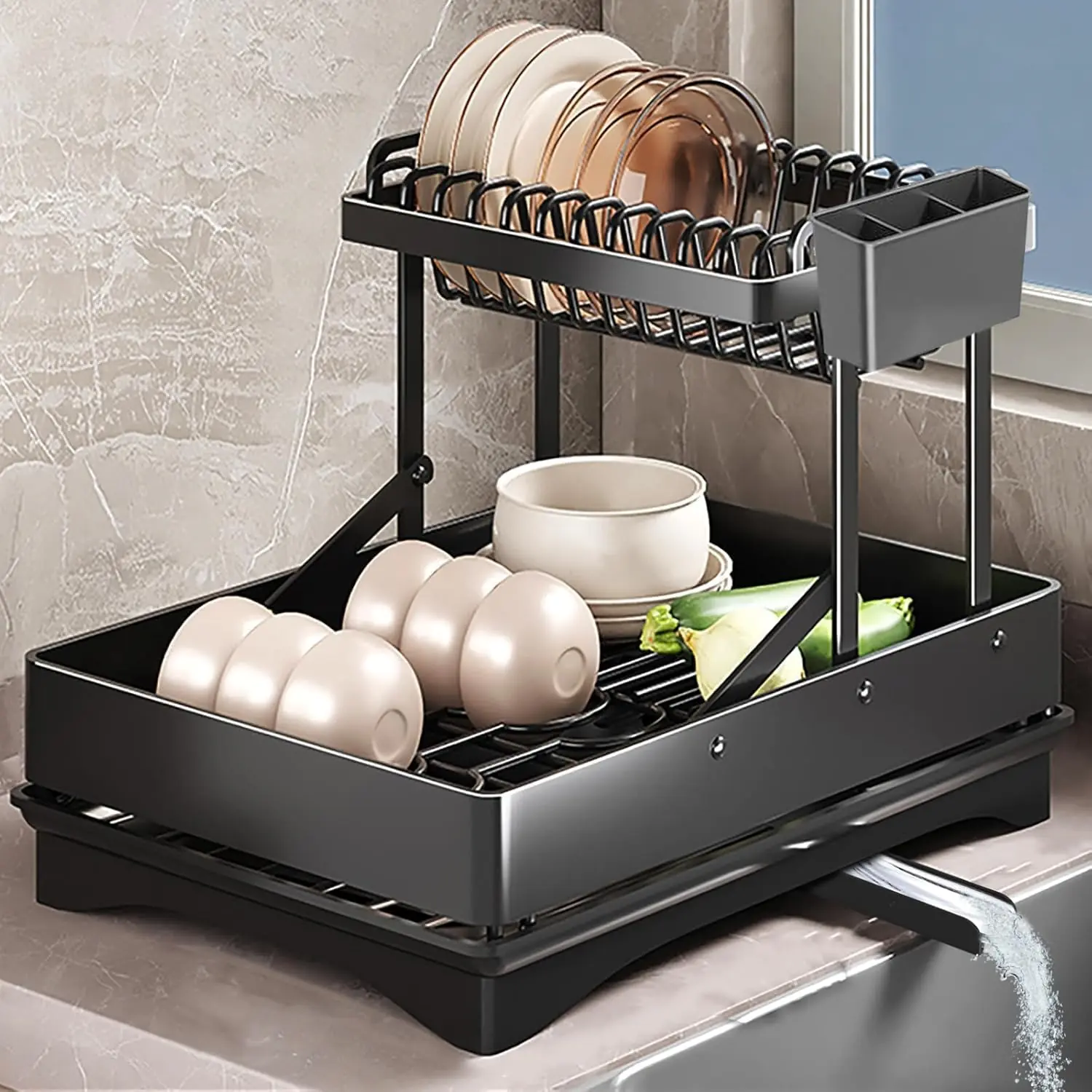 This Dish Rack for Kitchen Counter’s height adjusts from 4.7″ to 12.2″ with a simple installation program,Switch between single and double tiers to suit your needs,Increasing 50% of holding space for a tidy and organized kitchen and the space between the two layers is 6.3 inches, which is easy enough for you to reach the utensils
