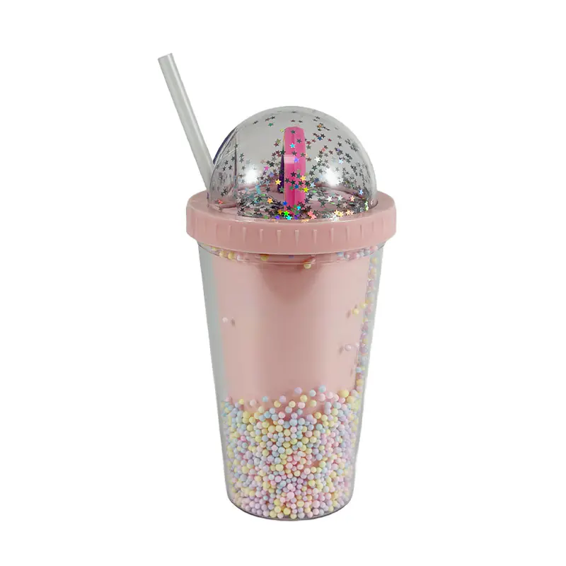 The Colorful Double-Layer Kids Tumbler Wholesale features a vibrant design that blends a pastel inner cup with a clear outer shell filled with floating macaron-colored foam balls. The dynamic movement of the beads creates a fun visual effect that instantly appeals to children and adds interactive enjoyment to everyday use.