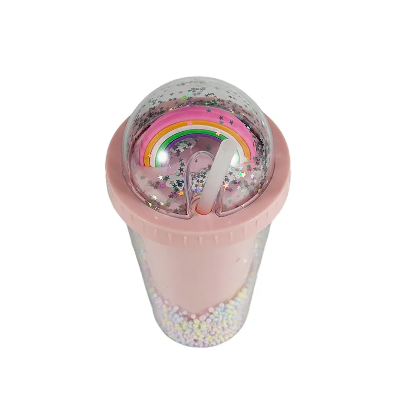 The Colorful Double-Layer Kids Tumbler Wholesale includes a glossy dome lid decorated with a bright rainbow and floating glitter stars. This “snow-globe” style top enhances the cup’s charm while providing splash resistance. The clear dome paired with the pastel base delivers a standout look ideal for kids’ products and retail displays.