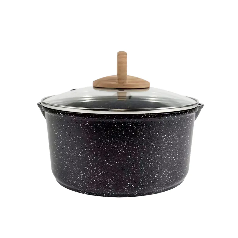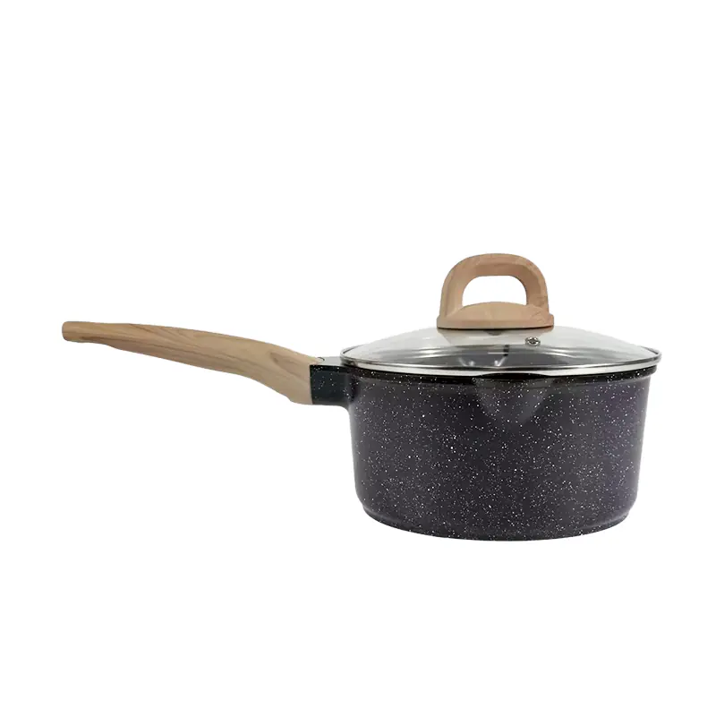 Durable Nonstick Saucepan Wholesale features a modern speckled body paired with a stylish wood-grain handle and lid knob. This natural-looking design adds warmth and elegance to any kitchen while maintaining a contemporary cookware style. The clear tempered glass lid allows users to observe the cooking process without lifting the lid, helping retain heat and moisture for improved cooking efficiency.