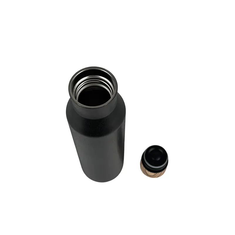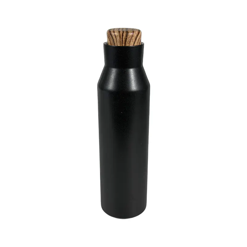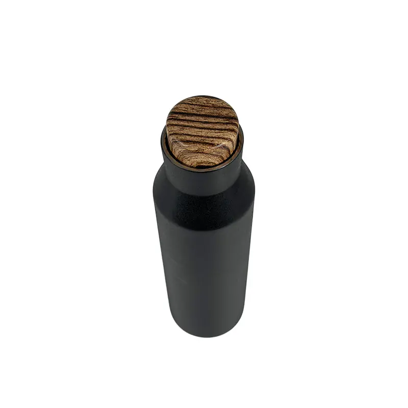 With a sleek black finish and wooden cap, this bottle combines functionality with a modern aesthetic.