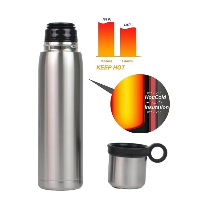 Our insulated 304 stainless steel thermal bottle features a versatile 4oz mug lid with a heat-resistant grip, ensuring your hands stay comfortable while sipping hot and cold drinks.