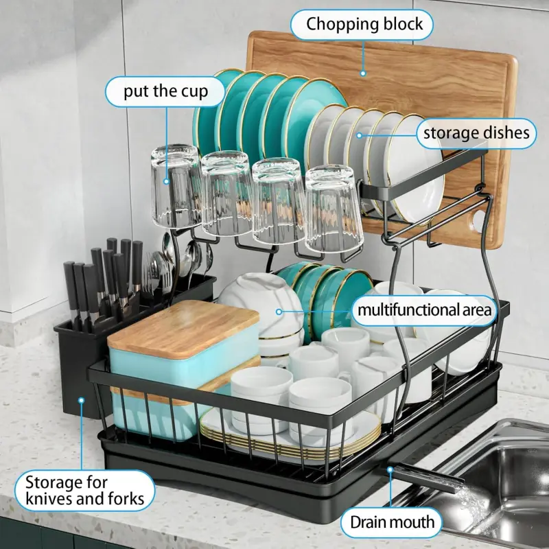 This Large Capacity Dish Drainer Organizer for kitchen counter take a detachable 2-tier design. Together with a utensil holder, a cup rack, providing a large space for storing tableware such as dishes, plates, bowls, mugs, kitchen pots and frying pans.