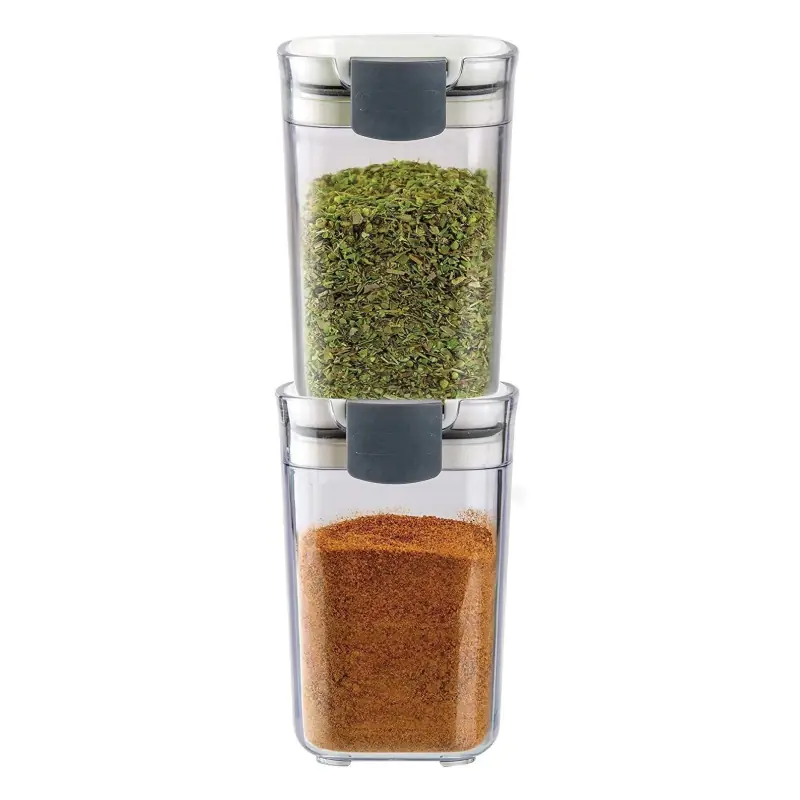 Los recipientes herméticos para alimentos Spice combinan una fabricación de alta calidad con un sello de silicona para un almacenamiento hermético. Estos recipientes compactos ayudan a organizar los armarios y a mantener los ingredientes frescos y sabrosos. La rejilla deslizante permite espolvorear la cantidad perfecta de canela, verter abundante orégano o medir la cantidad justa de cúrcuma.