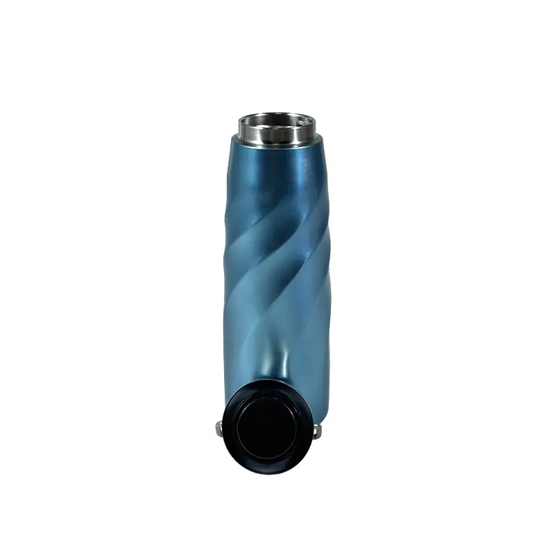 Featuring a vibrant blue body with a unique spiral texture, the bottle boasts both visual appeal and functional design. The textured surface not only adds a modern, fashionable touch that stands out in any setting but also enhances grip, preventing slips even when hands are wet or sweaty. This combination of style and practicality makes it suitable for both casual use and more active lifestyles.
