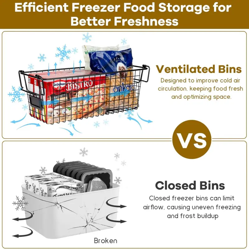 Unlike traditional closed plastic boxes, these freezer organizer baskets feature open frames for better air circulation, allowing food to freeze faster and stay fresher. The open design also works well as fridge organizers and storage for quicker access and organization.