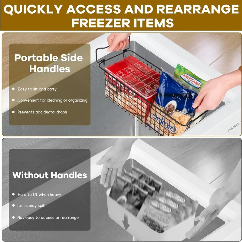 Foldable handles allow stacking to maximize vertical space and protect soft items from being squished before freezing. The freezer baskets for the chest freezer are easy to lift and move, making it simple to access items at the bottom and streamline inventory and stock rotation with your deep freezer organizer.