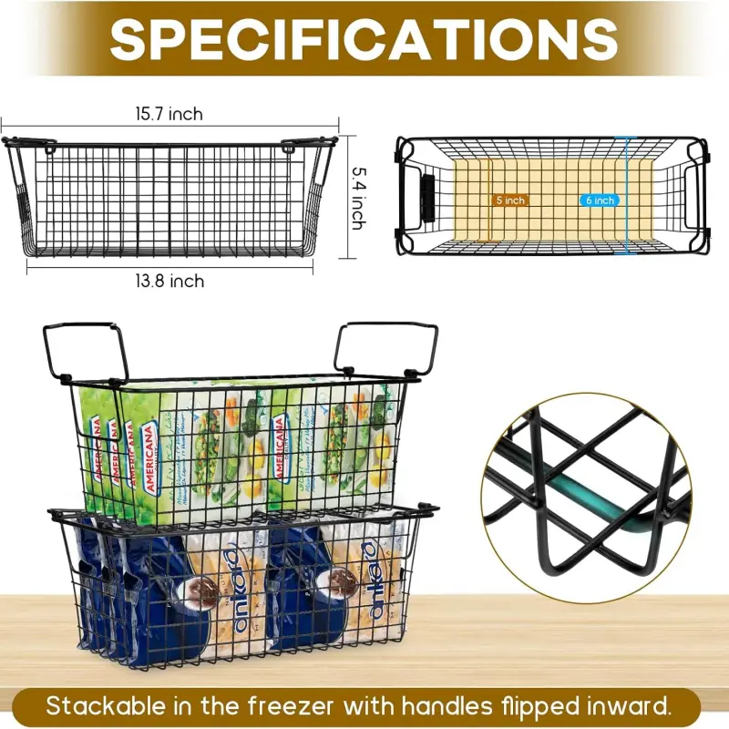 The freezer organizer baskets are built with 20% thicker wire than standard options, supporting up to 33 lbs of heavy items like meat. The open design allows easy visibility, so you can quickly locate food, even in the bottom bins, making these freezer organizer bins ideal for both deep and chest freezer storage.