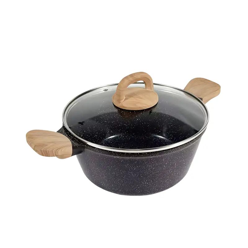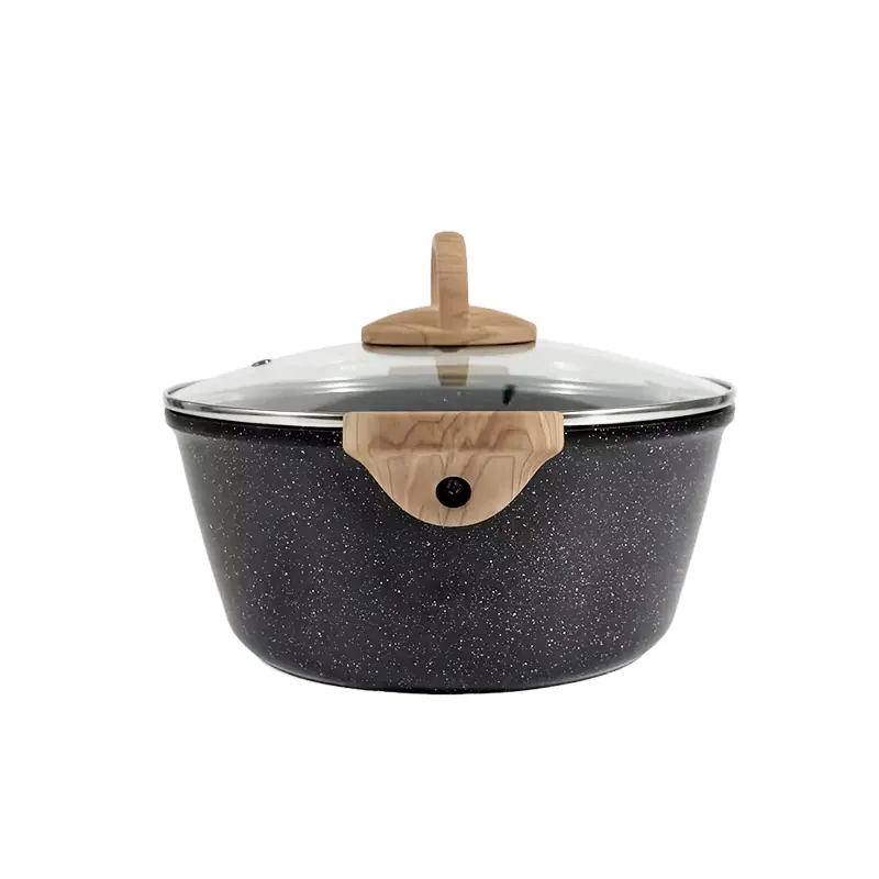Granite Nonstick Casserole Pot Wholesale includes ergonomically designed wood-style handles that remain comfortable to grip during cooking. The sturdy handles provide reliable control when lifting or moving the pot. Combined with the balanced pot shape and stable base, this cookware offers convenient handling for both beginner cooks and professional chefs.