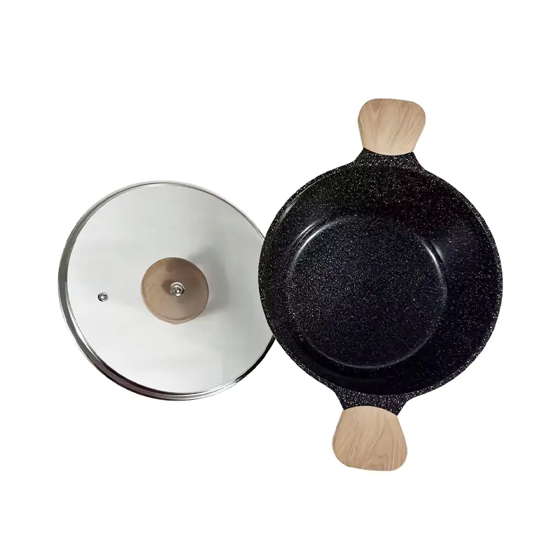 This casserole pot blends modern design, reliable durability, and practical cooking performance. The granite-style nonstick coating simplifies cooking and cleaning, while the elegant wood-grain handles enhance both comfort and visual appeal. Ideal for preparing a wide range of meals, it offers a stylish yet functional solution for modern kitchens. For distributors, retailers, and cookware brands seeking dependable kitchenware products, this model is a valuable addition to any cookware lineup.
