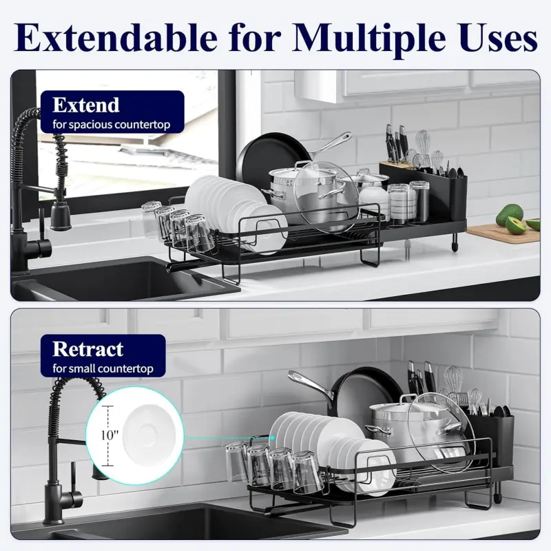 Kitsure Large Dish Drying Rack dish drying rack with drainboard features wide application. There’s a cutlery holder for spoons and forks, compartments for dishes, and cup holders for cups. You can set your kitchenware properly right after washing and keep the counter in order. with an extendable design can be adjusted to fit different kitchens. It measures 19.2″ to 26.7″ in length, and from 12.9″ W *5.9″ H . Therefore, you can just adjust the extendable tray as you need.