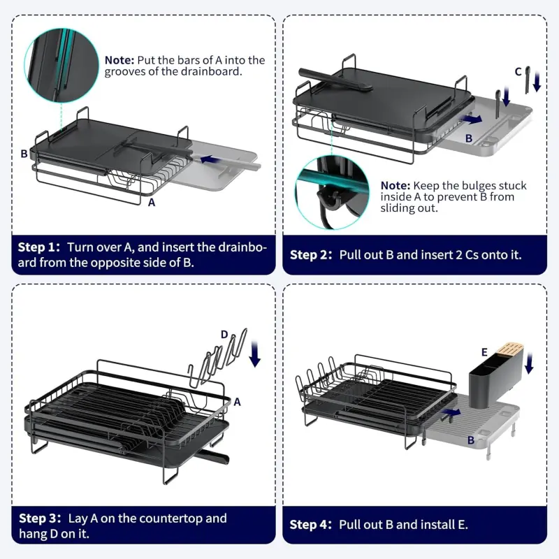 Kitsure Large Dish Drying Rack is equipped with a drainboard to gather excess water and a water outlet to lead the water to the sink. The water outlet can be adjusted to suit different sinks.