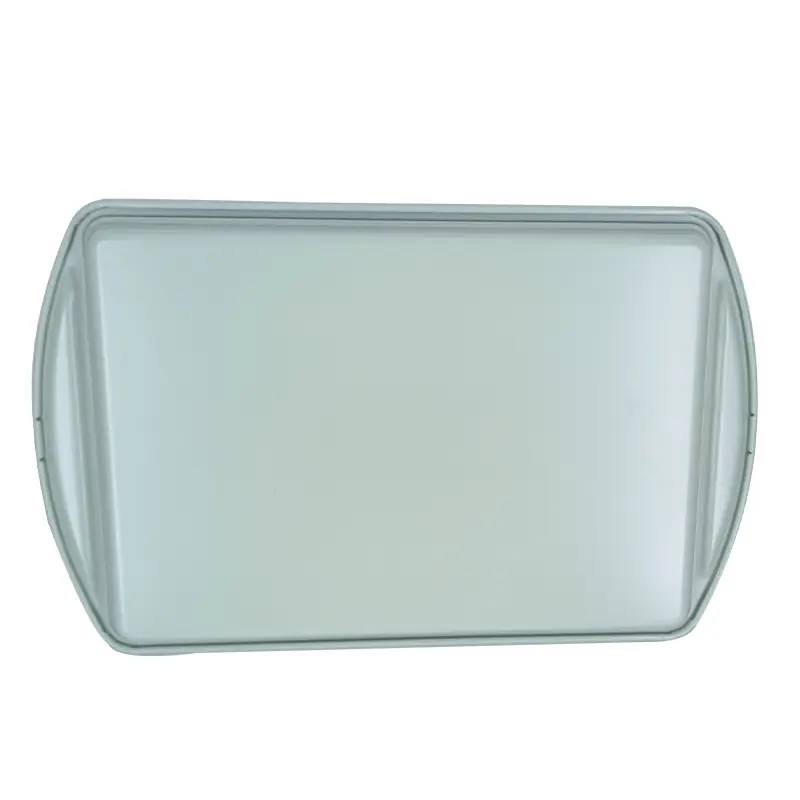 Light Green Carbon Steel Baking Pan features curved side handles. These handles fit comfortably in the hand, providing a secure grip for easy transfer to and from the oven. The smooth edges of the tray prevent scratches during use and cleaning, enhancing user safety and convenience.