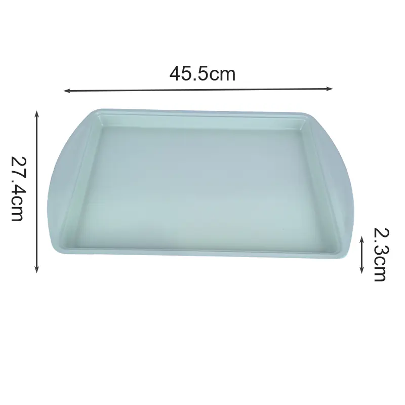 Light Green Carbon Steel Baking Tray combines the advantages of carbon steel—superb heat conductivity and durability—with an attractive light green color and user - friendly designs like curved handles and a non - stick coating. It simplifies baking processes, ensures easy cleaning, and adds a stylish element to kitchenware. Ideal for anyone seeking a blend of functionality, aesthetics, and convenience in their baking tools.
