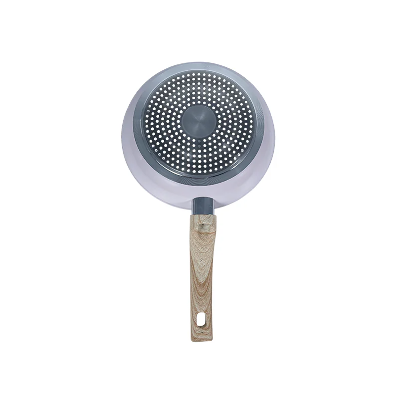 The Modern Nonstick Frying Pan Wholesale comes with an ergonomic wood-textured handle that stays cool on stovetops. It offers a secure, comfortable grip to prevent slips, even when moving the pan between burners or pouring food—enhancing safety for end-users in wholesale-distributed settings.