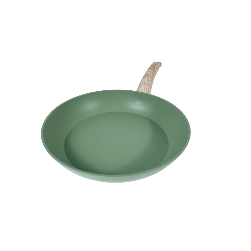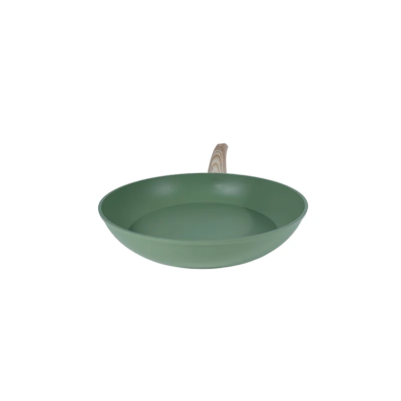 The Modern Nonstick Frying Pan Wholesale features a smooth, matte finish (available in muted tones like gray or green) paired with a wood-textured handle. This design balances understated style with rugged build quality—ideal for wholesale buyers seeking kitchenware that blends into diverse home or commercial spaces while withstanding daily use.