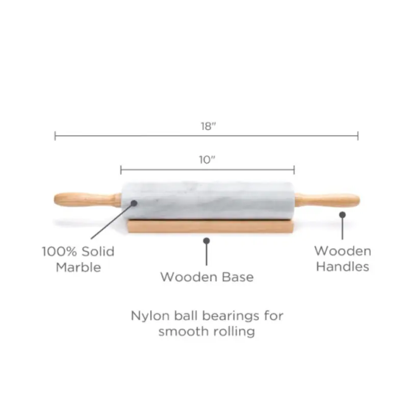 SOPHISTICATED DESIGN WITH ELEGANT BASE includes nylon ball bearings for smooth and continuous rolling. Polished Marble Rolling Pin also comes with a smooth wooden resting base for convenient storage.