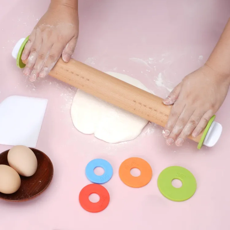 Rolling Pin with Thickness Rings is made of high quality beech wood structure, engraved in inch and centimeter dimensions, and different thickness ring devices can be attached/removed at both ends.