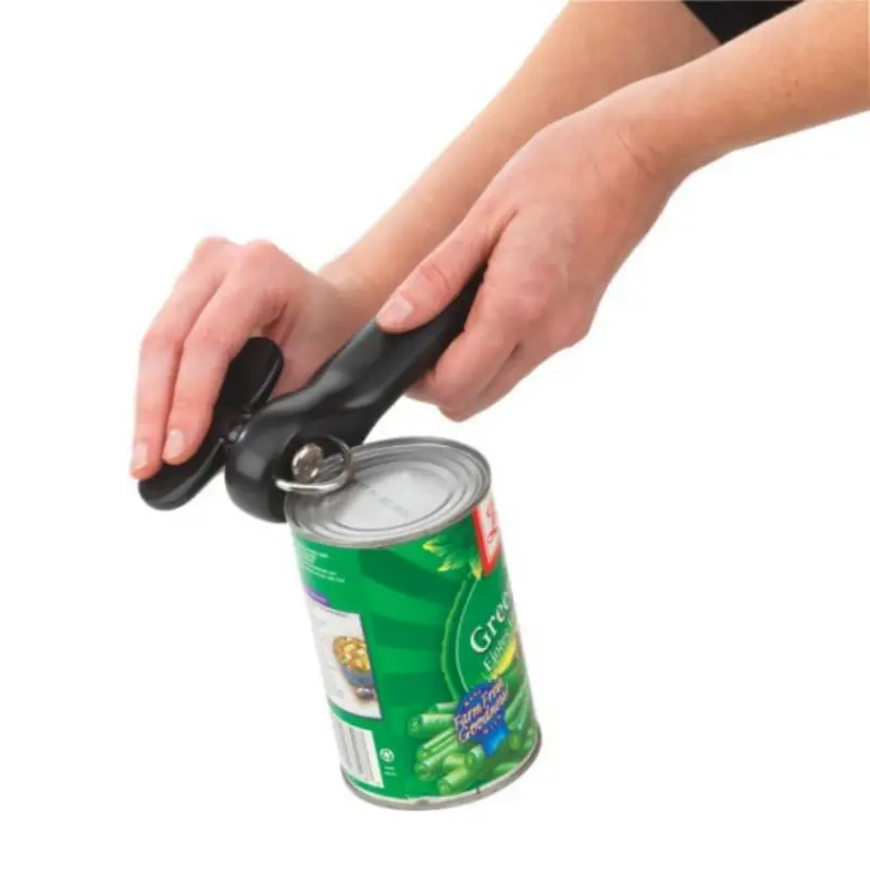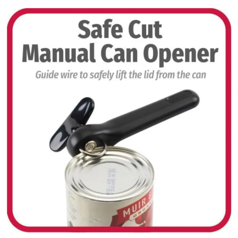 Designed to be safe and easy to use, this smooth-edged Safe Cut Manual Can Opener cuts efficiently without creating sharp edges. The ergonomic handles provide a firm, comfortable grip.
