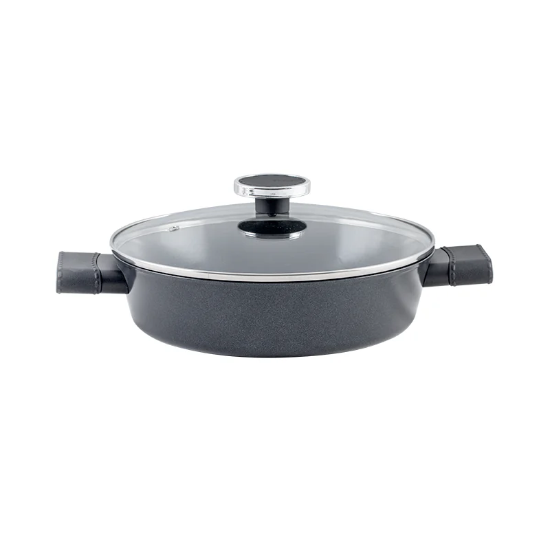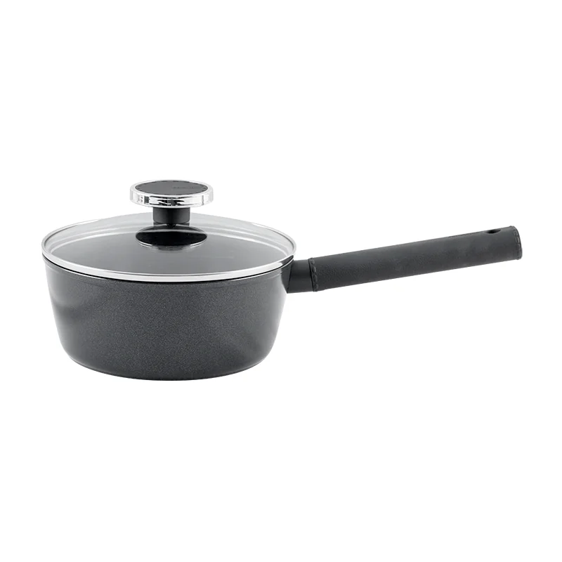 This sleek black aluminum cookware set with glass lids has a smooth and modern black appearance. It gives your kitchen a sense of sophistication and elegance, making it a stylish addition to your cooking space.