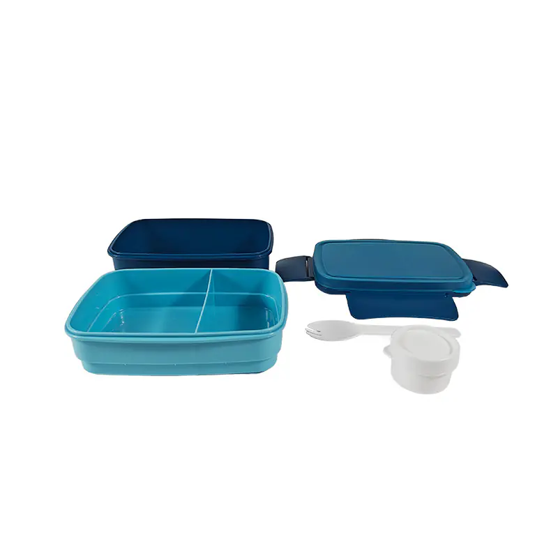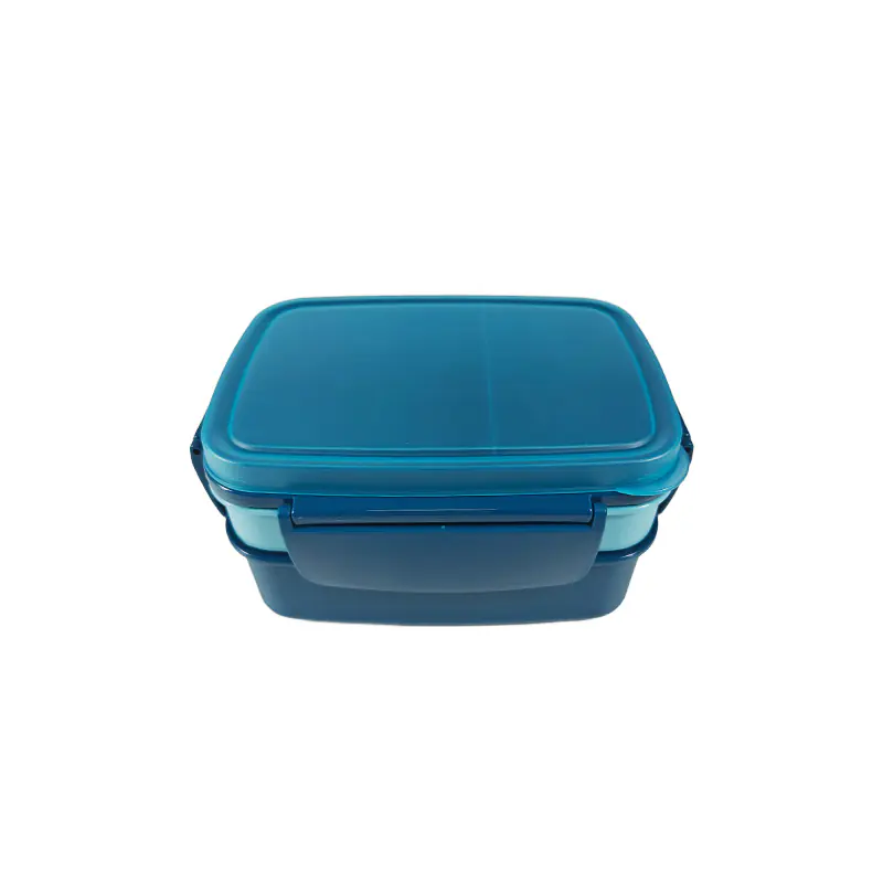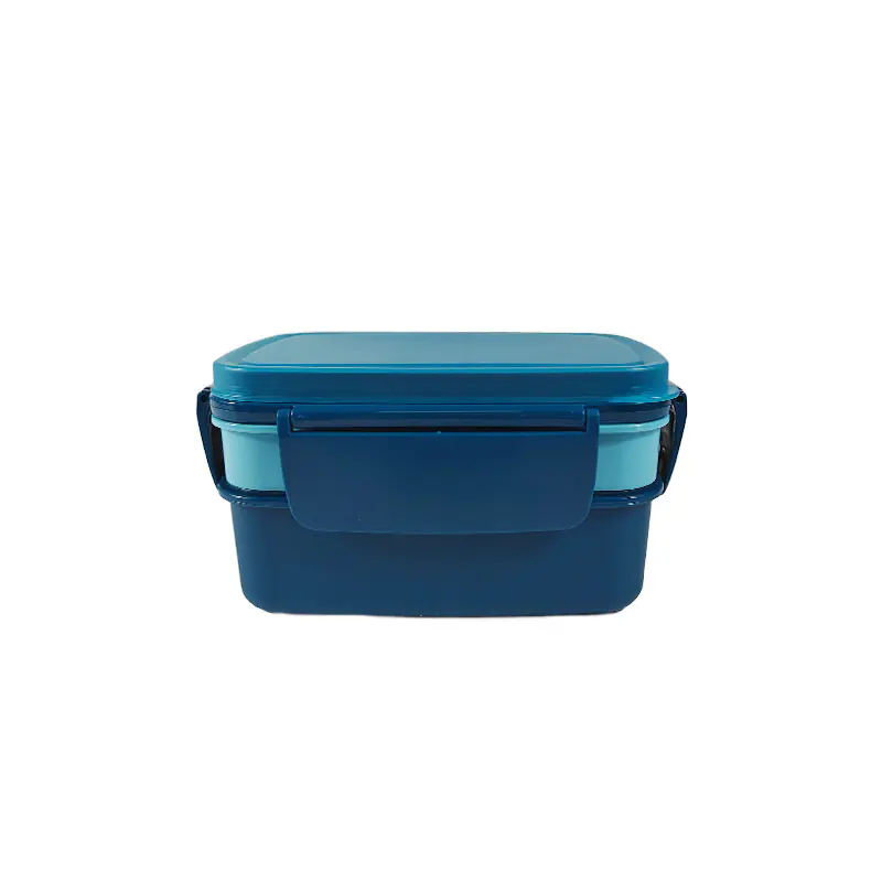 To sum up, this stylish blue double - layer lunch box with accessories is a great option for wholesale. Its attractive design, smart compartmentalization, included utensil and sauce container, and secure latches make it a practical and stylish choice for anyone needing a reliable lunch solution. It combines functionality with a modern aesthetic, ideal for suppliers.