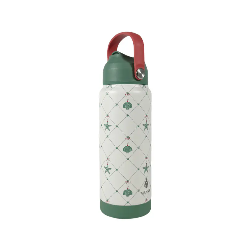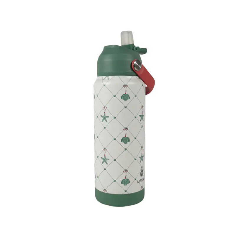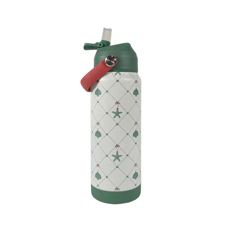This patterned insulated water bottle with sturdy handle showcases a charming, unique print. The delicate designs, like the starfish and shell motifs, add a touch of style, making it not just a hydration tool but also a fashionable accessory that stands out in daily use or outdoor outings.