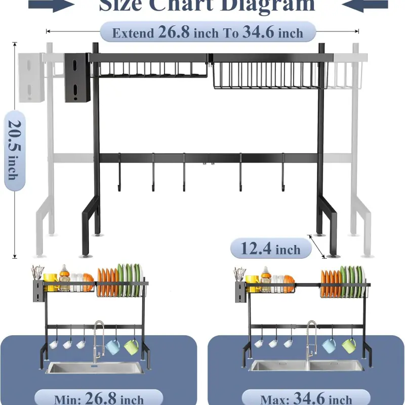 made of high-quality metal stainless steel for long-term use. The over-the-sink dish drying rack Load-bearing is 80 pounds.