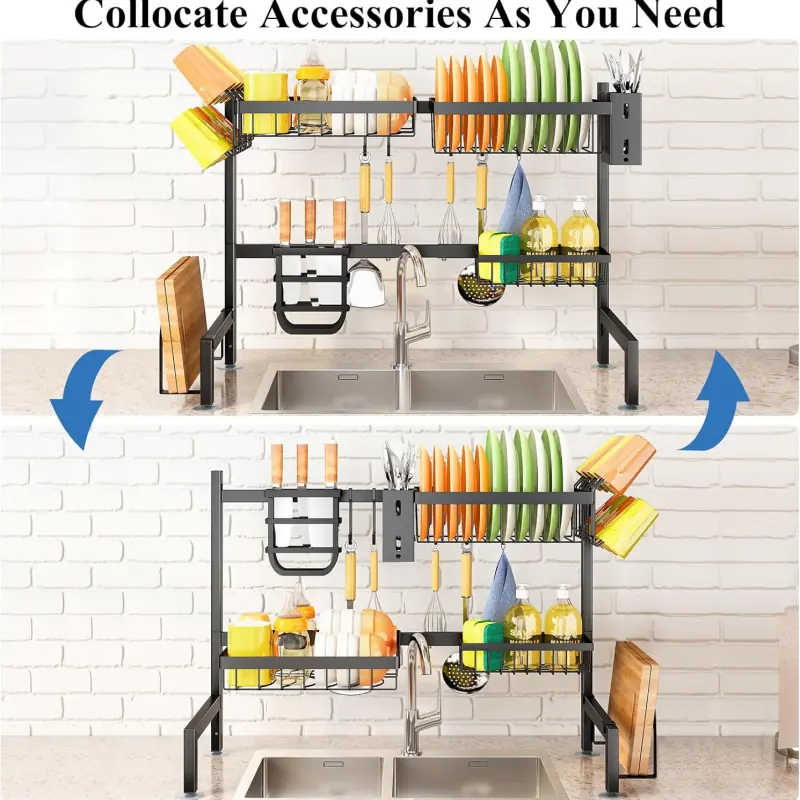 A great solution for adding vertical counter space, with an over-the-sink design that water on a dish or spoon will directly drain into the sink for small kitchens and a counter organizer. All the dish drying racks and their accessories can be hung and removed as your will.