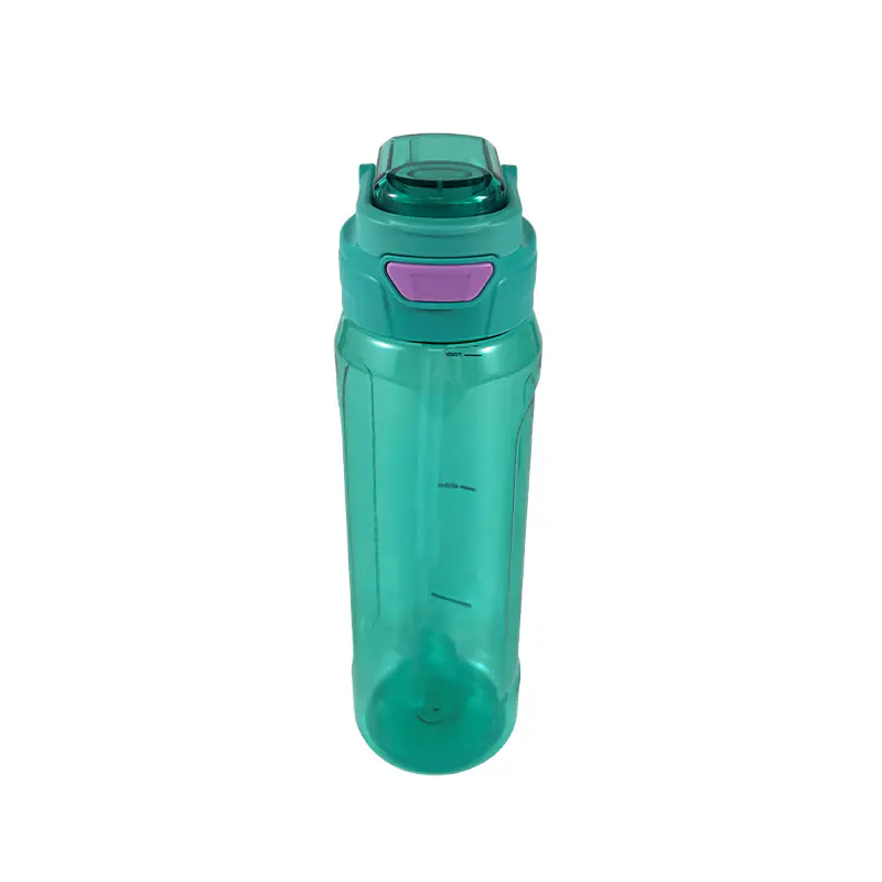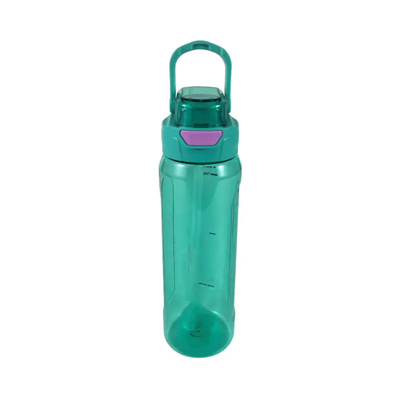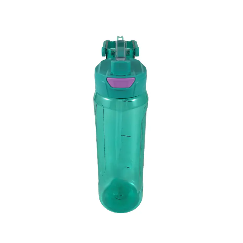 This vibrant teal transparent plastic water bottle equipped with a one-click flip-top lid for easy one-handed sipping, it has a secure leak-proof seal to prevent spills. The built-in carrying handle allows for hands-free portability, and clear volume markings on the body help track water intake throughout the day.